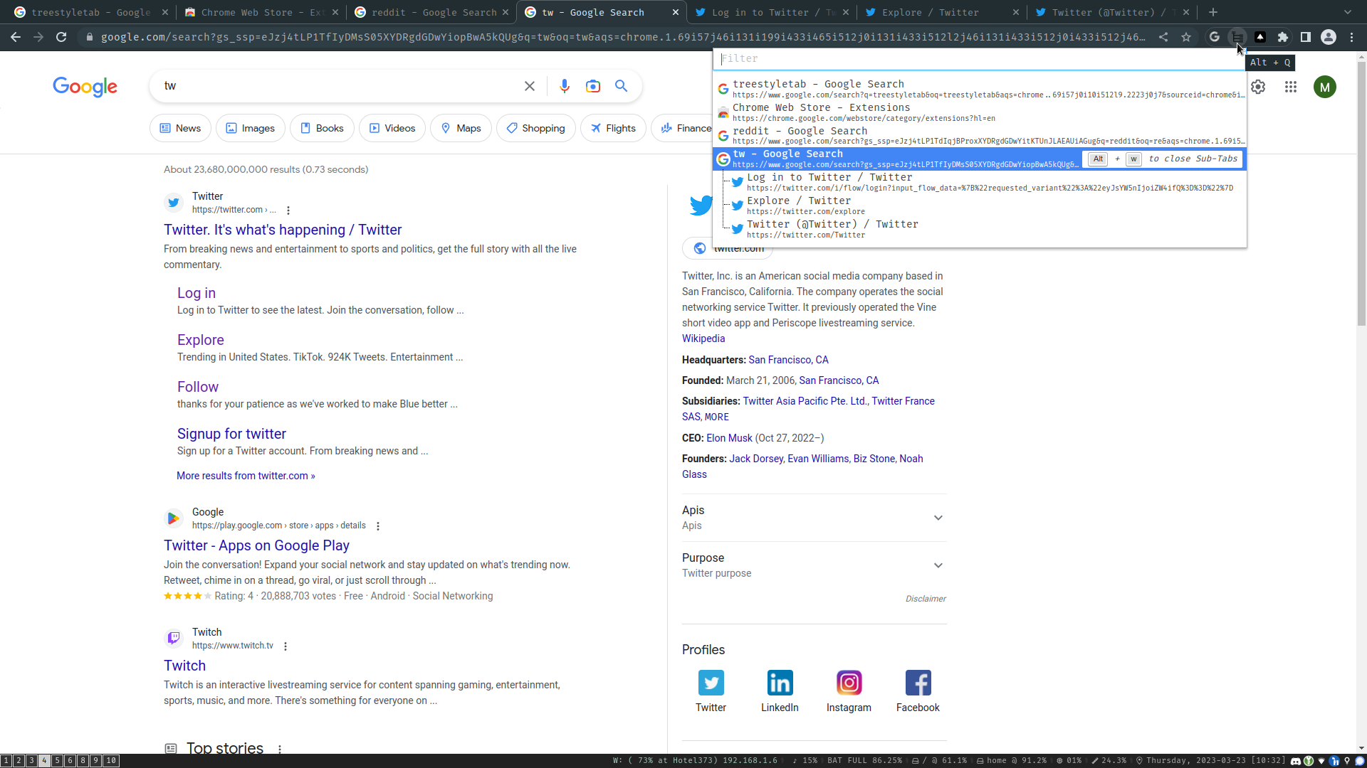 Most people use Chrome, which so far as I can tell doesn’t allow modifying the UI to hide the original tab bar. People have made Chrome extensions that supplement the bar with a shortcut-invokable tree popup, which isn’t what I’m used to, but has its own kind of charm. Regardless: consider demanding a better tab experience from your favorite browser. We can do better than The Bar.