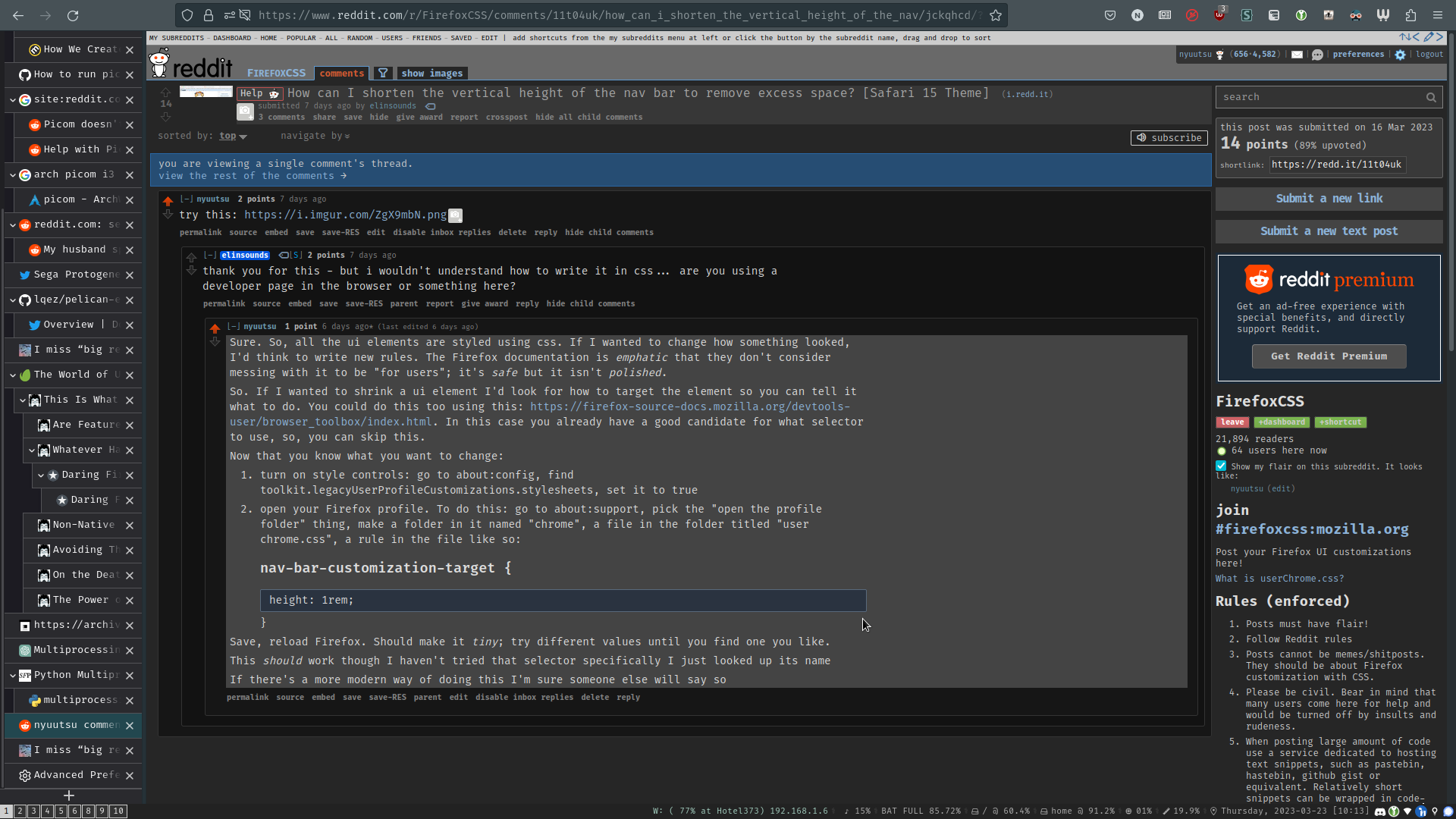 firefox open to one of my reddit comments with the stock tab bar hidden and the treestyletab addon enabled
