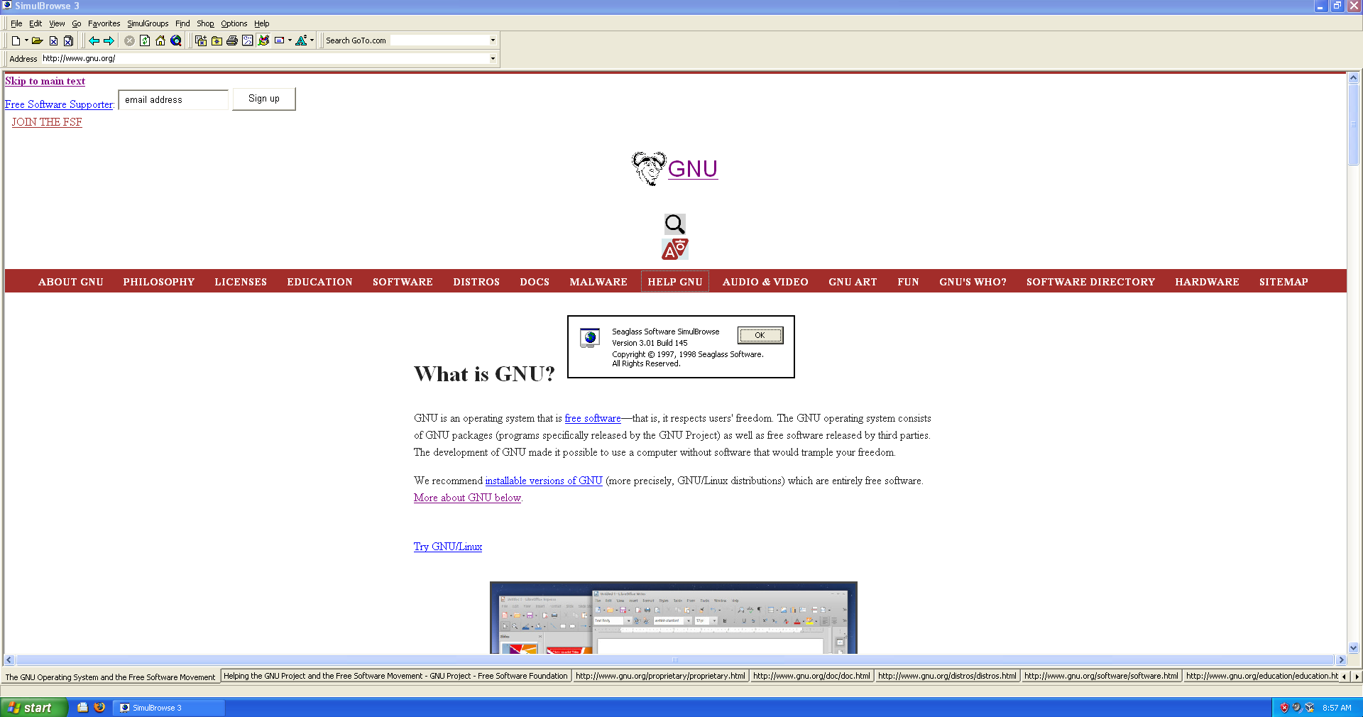 several tabs on http://gnu.org/ open in SimulBrowse 3.0.1