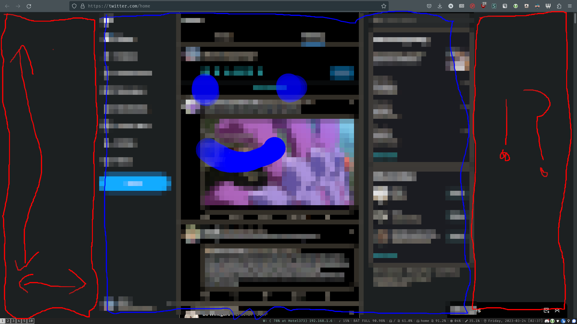 twitter viewed in my web browser with the padding indicated in red and the content indicated in blue